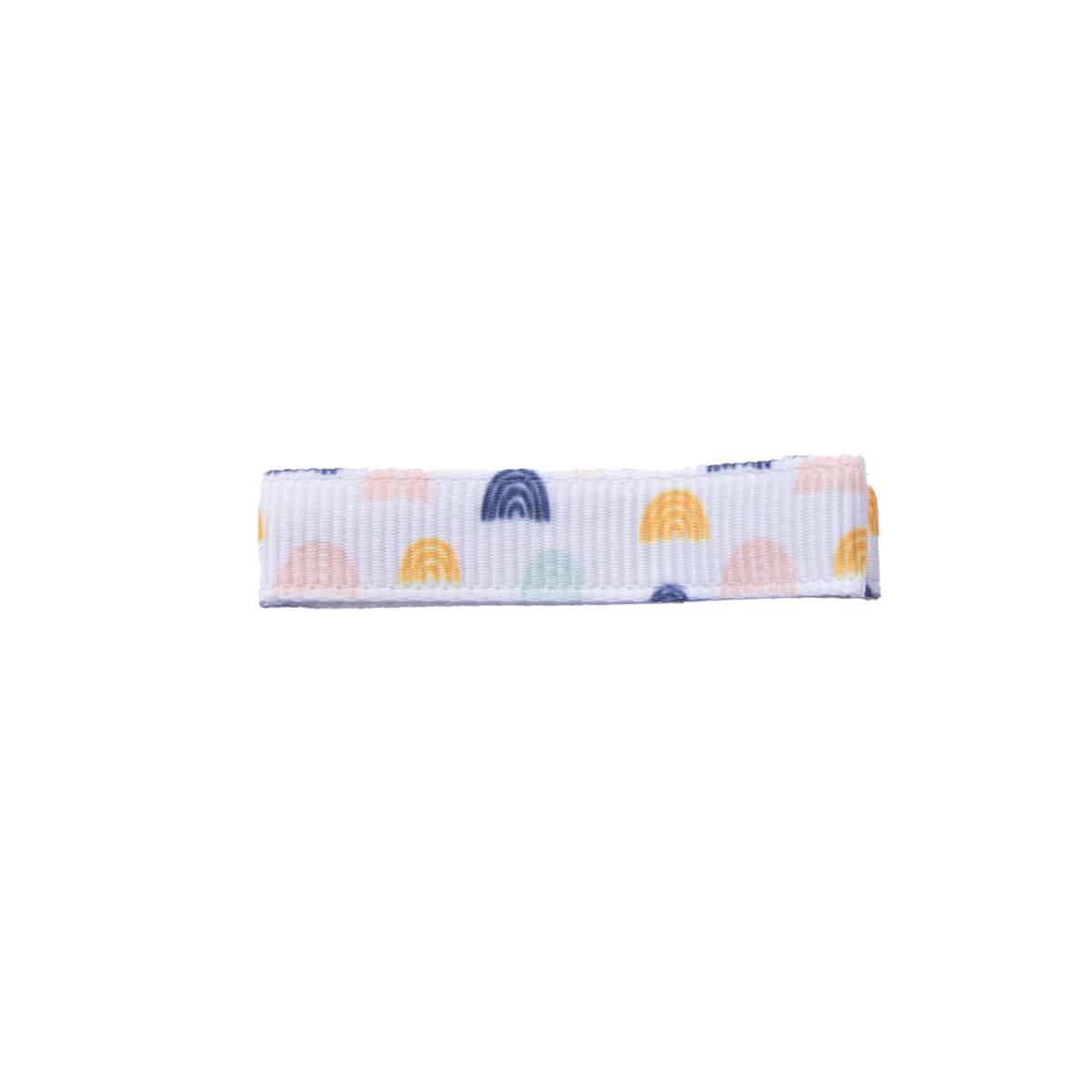 Barrette pince anti glisse en ruban gros grain imprimé de petits arc en ciels multicolores.