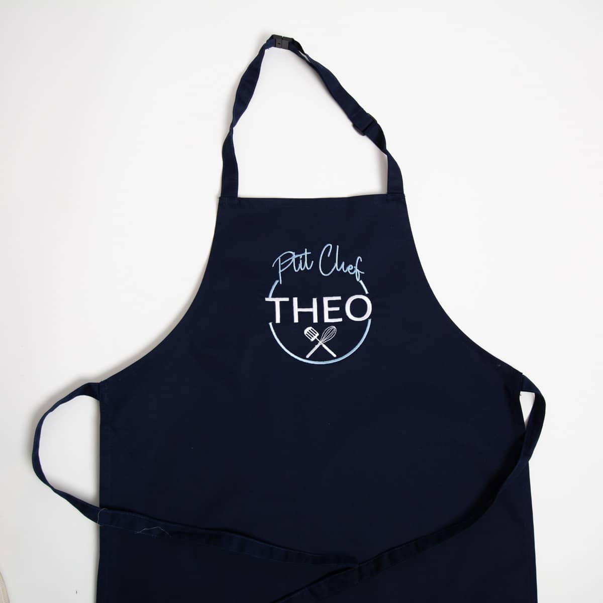 Tablier de cuisine enfant bleu marine personnalisé et brodé avec le prénom.